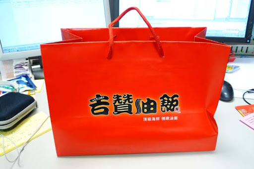 油飯送來的時候,是用一個大大的紅紙袋裝著,外面當然是印著吉贊油飯的字眼。
