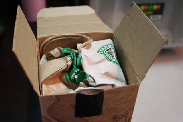割開黑膠帶,打開紙盒,看到Starbucks的紙袋緊緊的塞在盒內,也達到了部份耐撞緩衝的效果。