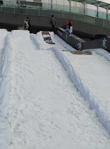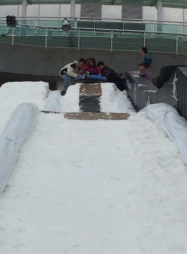 這不是霸王級寒流造成的降雪累積出來的,也不是台灣每逢五月就會有的油桐花五月雪,而是由熱雪 (Hot Snow) 這間公司,利用自家研發出來的仿雪材料,在新竹世博館所推出的高速滑雪賽道。以往只有在國外才有機會玩到的 ice tubing,像我去年年底時,去美國太浩湖就沒玩到,現在在台灣居然就可以玩到了。