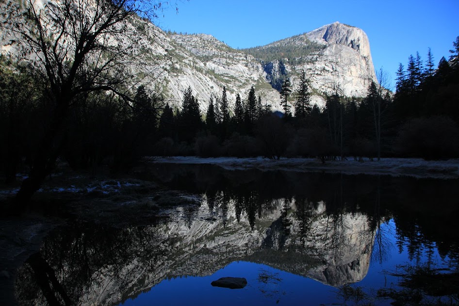 不過因為我們是冬天來訪,所以算是優勝美地的枯水期,所以 Mirror Lake 的水量並不多,因此要試著從各個角度來觀看,找出可以拍出倒影的位置。相信如果是春夏時候來的話,Mirror Lake 的湖水比較多,也會有更漂亮的風景。